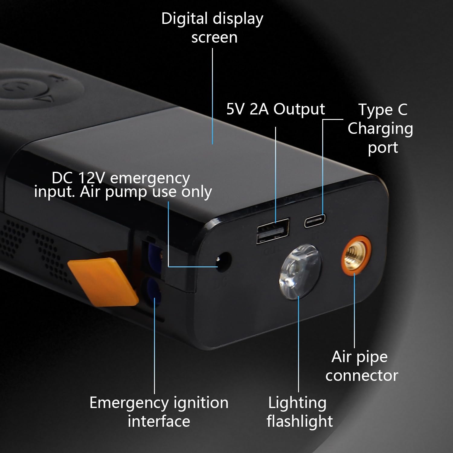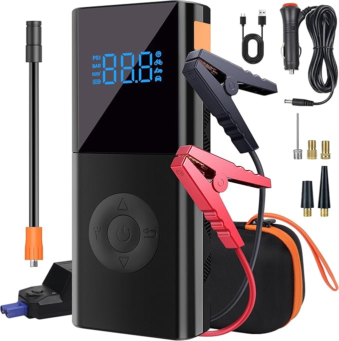 Arrancador portátil de autos con potencia de 3000 A, ideal para motores de gasolina de hasta 9.0 L y diésel de hasta 7.0 L. Funciona como amplificador de batería de 12 V e incluye luz integrada para mayor practicidad.